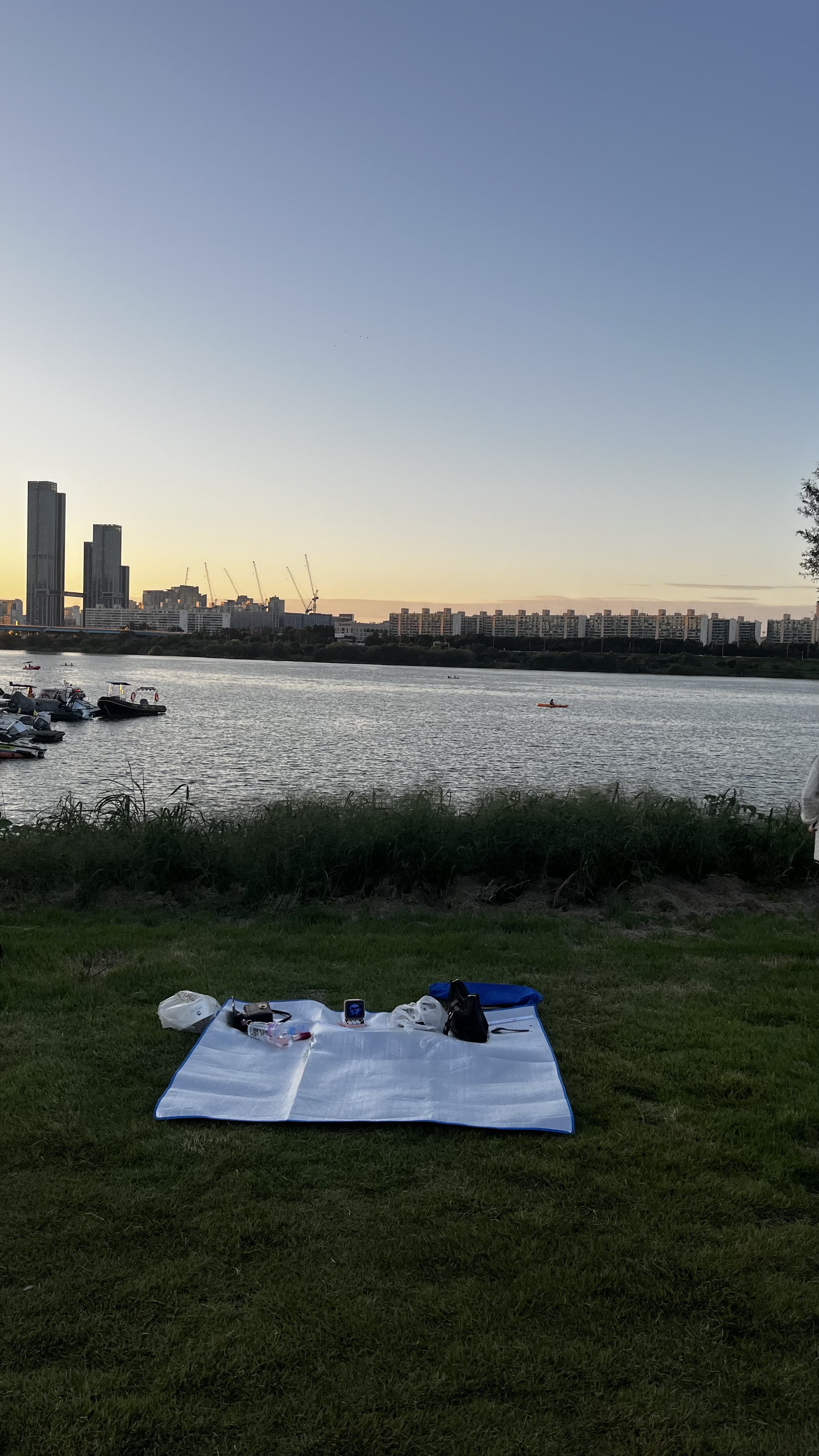 勉強の合間には、友達と一緒に漢江にピクニックにも行きました。芝生の上にレジャーシートを広げて、韓国ならではのチキンを食べながらゆっくり過ごしました。夕方には空がオレンジ色に染まり、夜には川沿いのライトや建物の明かりが水面に反射して、とてもきれいでした。噴水ショーも見ることができて、水と光と音楽の演出が幻想的で、思い出に残る時間になりました。